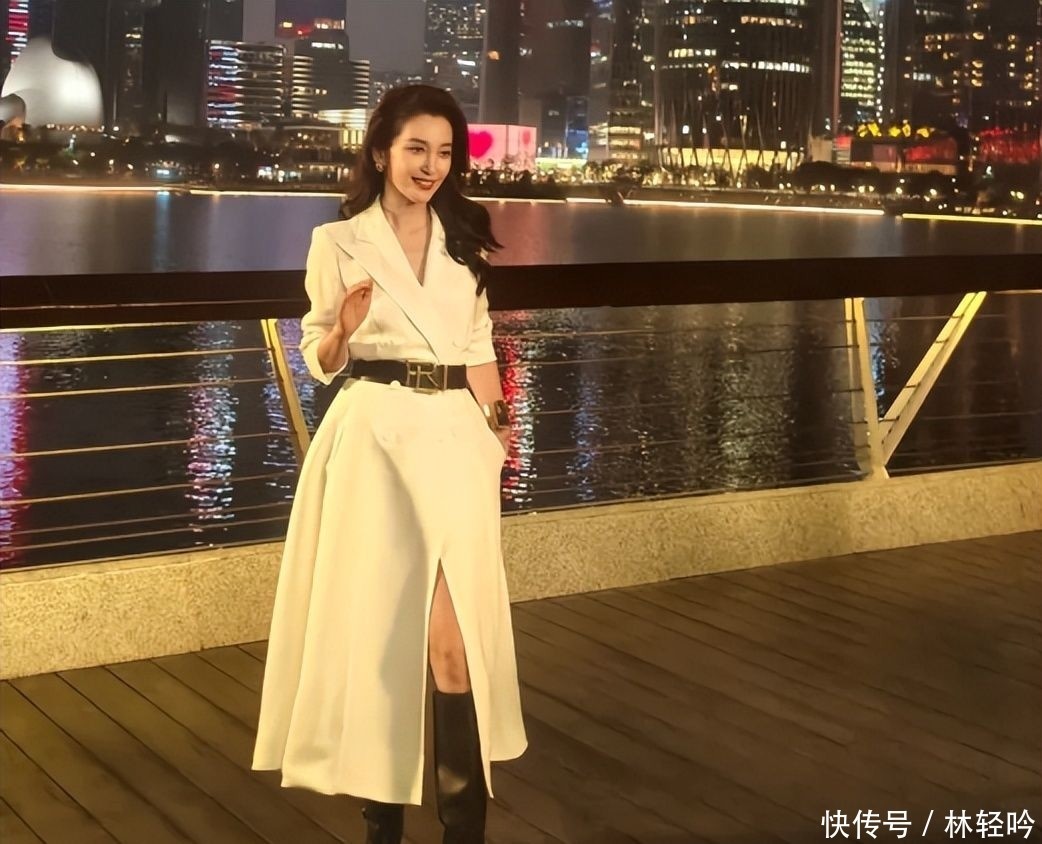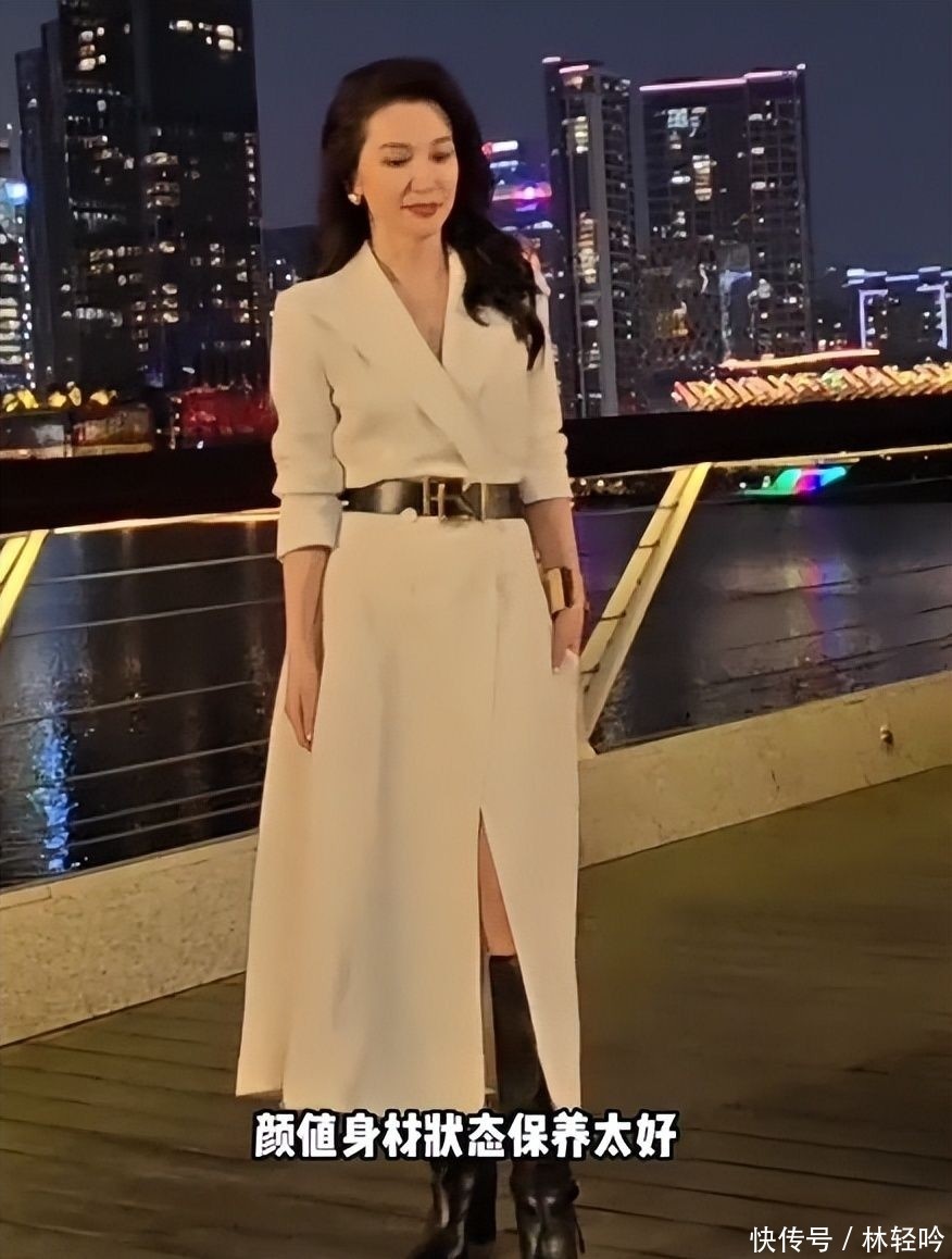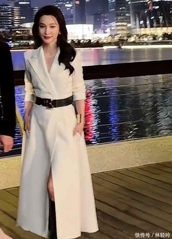 她身着品牌马年限定系列定制款纯白西装裙,利落挺括的西装领线条勾勒出修长颈线,裙长精准落在膝下五厘米处,恰到好处地展露匀称纤细的小腿轮廓,丝毫不见半分“五十+”的迟滞感。