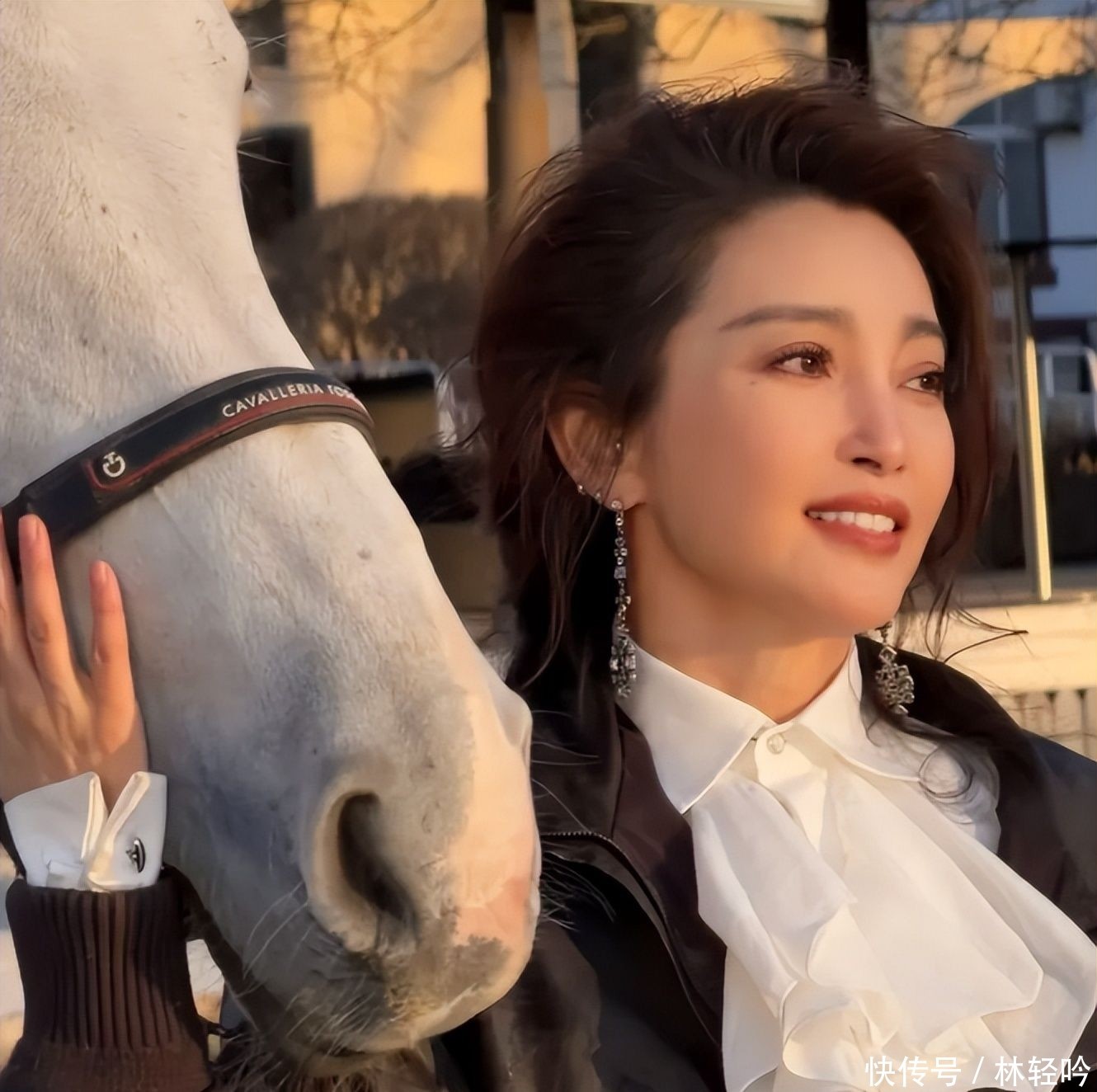 当日妆容亦是点睛之笔:底妆通透如瓷,悄然抚平眼尾细微纹路;眉形自然微扬,不刻意描摹却神采自生;唇色选用低饱和豆沙调,温润不抢镜,一笑之间眼波流转、光晕浮动,毫无用力过猛之感,只余从容自在的亲和力。